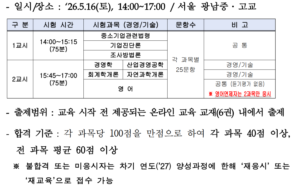 Q1. 양성과정 수료시험의 일정 및 장소, 시험 범위 등 기본사항이 궁금합니다.